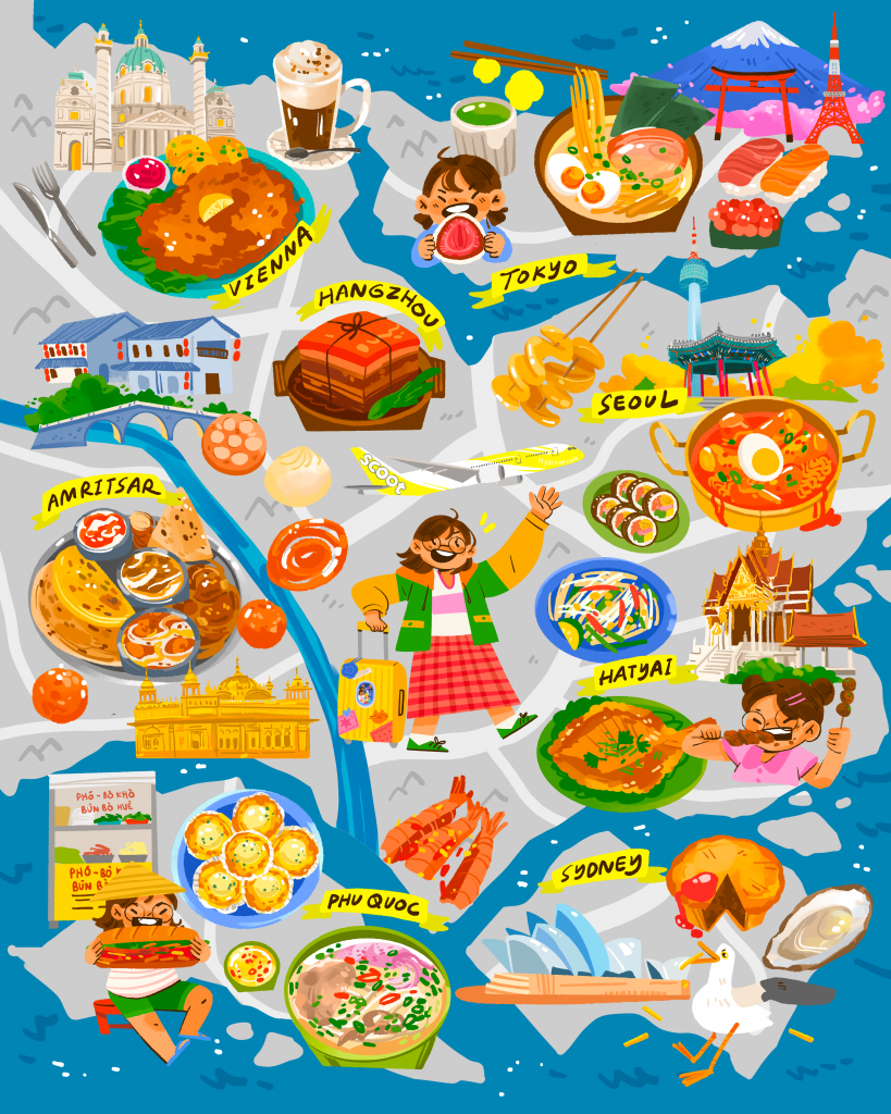 插画师 Riynn Lee 表示:“我非常荣幸,也非常兴奋能与酷航合作。作为创作者,我对‘用画面讲述自己的旅程’特别有共鸣。在富国岛的旅途中,我再次意识到食物对像我这样的马来西亚人有多重要,毕竟我们天生就是热爱美食的民族。我也发现,每段旅程都是一则故事。因此我希望这幅插画能捕捉到当时的好奇、趣味与美好体验。我也希望马来西亚人能在插画里看到自己,并受到启发,与酷航一起追寻更多属于自己的美食探索旅程。”